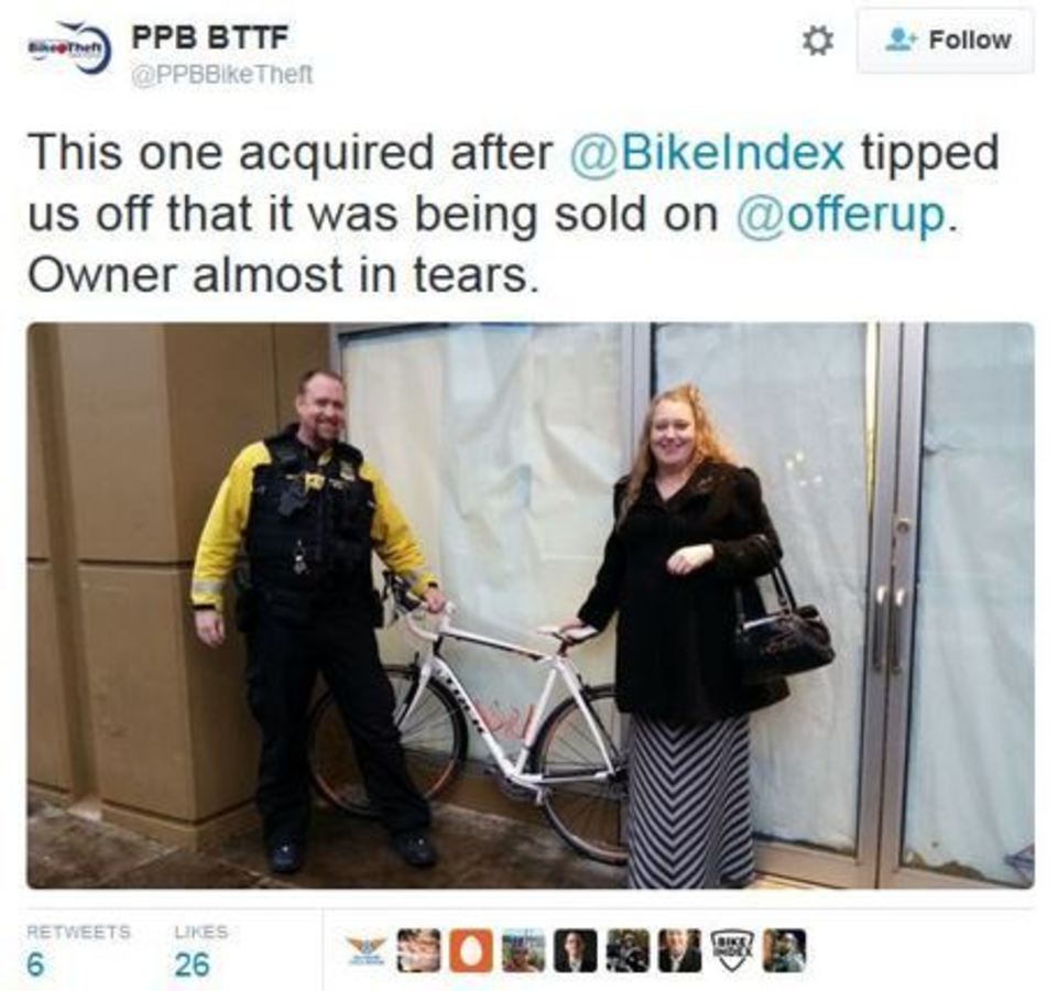 One of the largest problems we face are several problematic online marketplaces (that we're sure your departments are already more than familiar with) where bike thieves sell stolen goods with impunity. Our online 'spotters' find a continuous stream of bikes for sale on these websites and apps, and Bike Index works with both victims and law enforcement to recover stolen bikes being sold online whenever possible. It's a great example of the community stepping up to monitor services that refuse to police themselves.