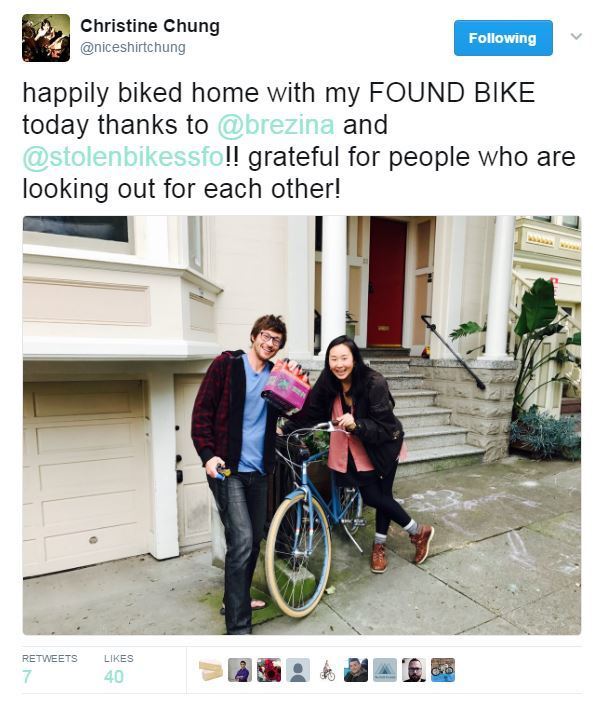 "Someone tweeted at Bike Index (@stolenbikessfo) and we were put in touch! It was TWITTER MAGIC!!!" (You can see the whole thread here - thanks @brezina)