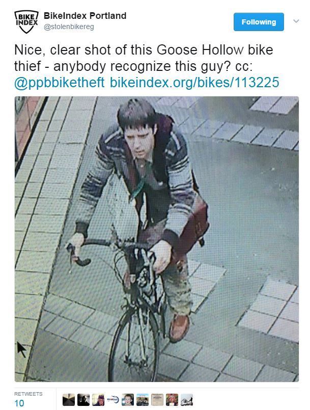 This bike was stolen off of Portland's MAX line ... the photo shown here shows the guy taking off on this bike at the Goose Holloe station. We put this on our Portland twitter feed, and then .... "Police called yesterday. Said someone rode it up to the station and dropped it off. Officer was as bewildered as I am."