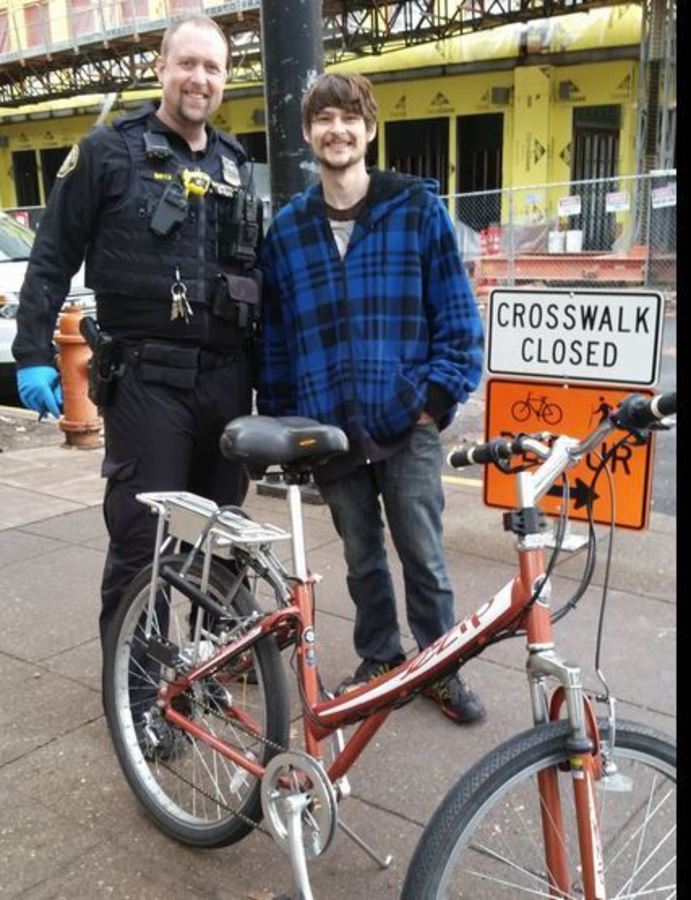 Another bike found by the Portland Police Bureau and ID'd via the Bike Index. The owner took this great photo when she was reunited with the bike.