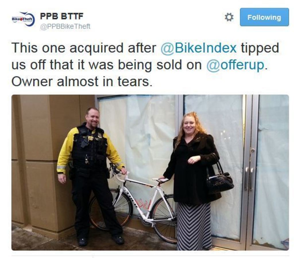 We spotted this one for sale on OfferupNow.com, and engaged the Portland Police Bureau's @ppbbiketheft officers to do a meet-up and an ensuing sting. They posted this photo once the bike was returned, noting "... acquired after @Bike Index tipped us off that it was being sold on @offerup. Owner almost in tears."