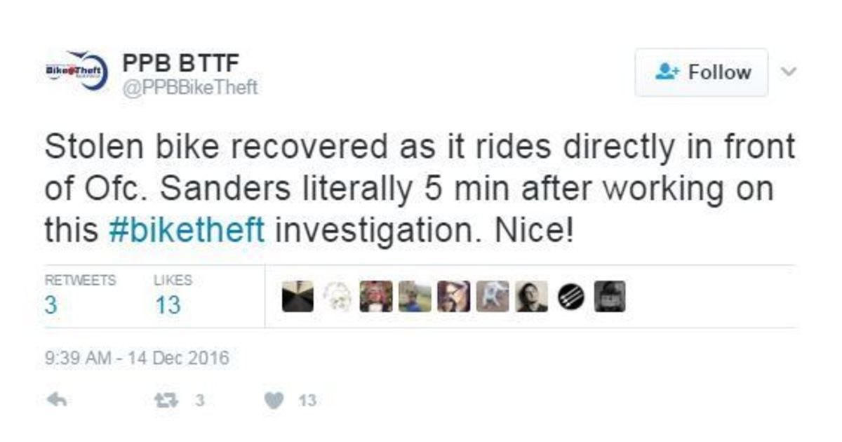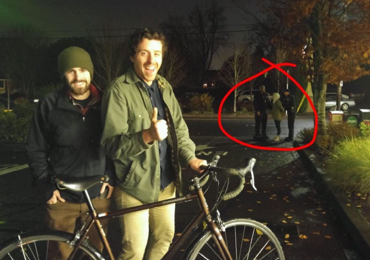 • A stolen bike rides directly in front of one of the Portland Bike Theft Task Force officers. Nice luck, that!