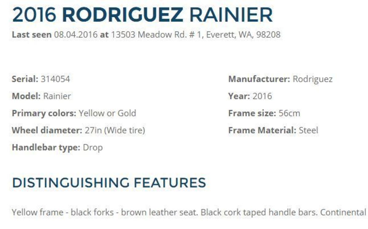 This stolen RODRIGUEZ RAINIER went from Washington State to New York - via Ebay - only to have the buyer find out it was stolen when he recieved the bike and checked the serial. Lots of red tape later, it's coming home: ' Thanks for checking back. I'll be getting the bike back. The gentleman who bought it received his reimbursement from eBay today and he says he's dropping it by his local bike shop Saturday so they can box it up and have it shipped to me.'