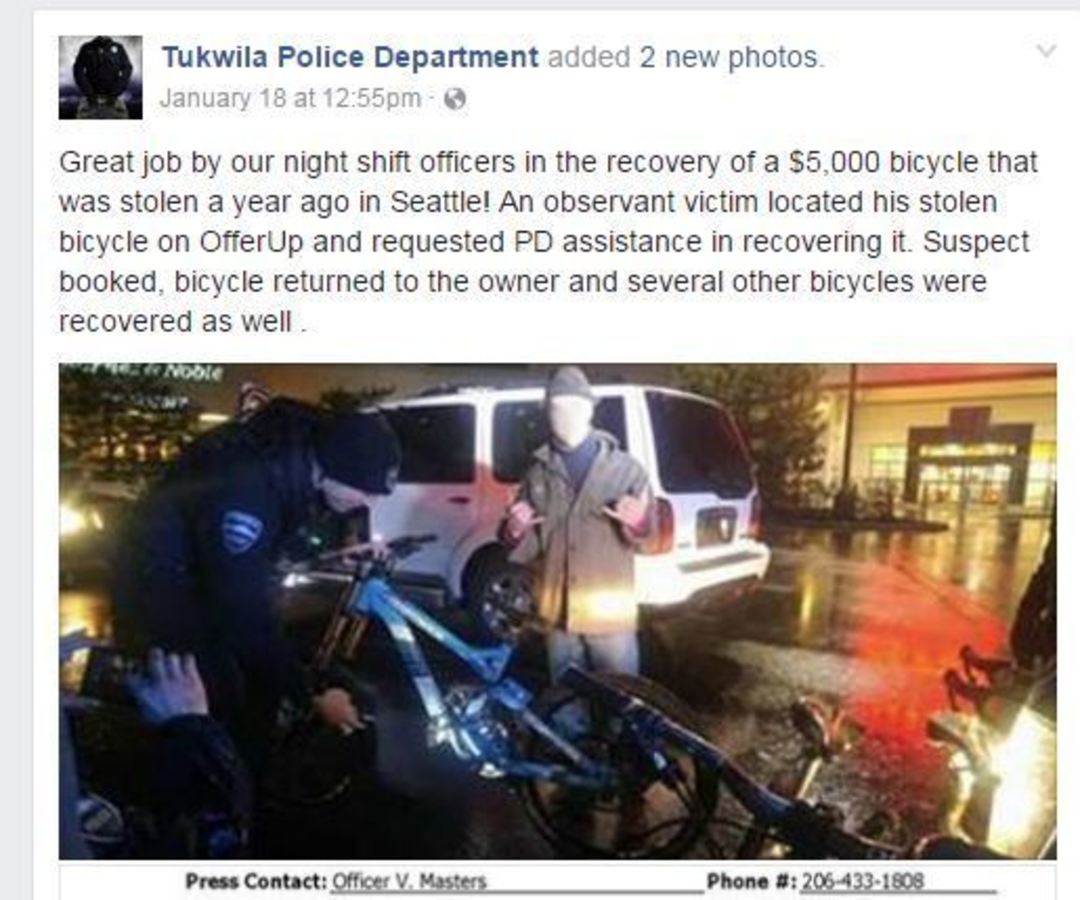 This stolen Commercial Supreme DH was spotted for sale (on Offerup, natch) and we alerted the owner, who alerted police. In a pretty epic recovery, the Tukwila PD not only busted the seller and recovered multiple bikes for this same victim - but they recovered several other bikes in the sting as well. The owner says: "The really nuts thing was that at around 5pm the guy asks me if I want a Banshee Rune too, another high end bike that was stolen from me as well. I tell him sure. So I got back my DH bike -- and my trail bike too! One year later! Couldn't have done this with out Bike Index's amazing help!!!"From the Tukwila PD Facebook post: "Great job by our night shift officers in the recovery of a $5,000 bicycle that was stolen a year ago in Seattle! An observant victim located his stolen bicycle on OfferUp and requested PD assistance in recovering it. Suspect booked, bicycle returned to the owner and several other bicycles were recovered as well ."