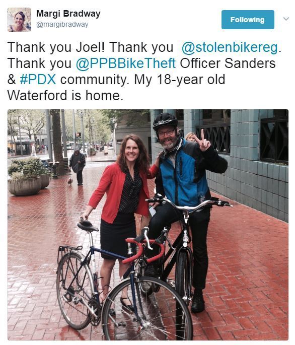 This is possibly the most Portland recovery ever: We had a hand in recovering the stolen Waterford that Margi Bradway - Portland Bureau Of Transportation's Active Transportation and Safety Division Manager - has owned for over 18 years. Not only that, but the spotter and all around awesome guy who got it back is a volunteer with The Street Trust (formerly BTA) as well. Here's the scoop: "Good day, and good news... Looks like Bike Index has come through for you. A colleague owns a 90's Waterford, so seeing yours being casually ridden in Old Town yesterday was out of the ordinary. I was on my way to the Street Trust (BTA); I'm a member and volunteer. Long story short, the 'story' of the person who had your bike changed considerably from where it began when I first approached and 'asked nicely' about the Waterford..."