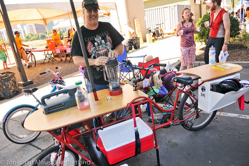 Someone spotted this very, ah, oddly configured cargobike stashed behind their apartment building and got in touch. Even though it wasn't listed in the Bike Index, I rode over on my lunch break and quickly ID'd it as a cargobike/blender combination build from Toms Cargo Bikes in Portland OR. BikePortland.org got in touch with the owner and found that someone had stolen it from a homeless youth outreach program run by 'Outside In' - a non-profit based in downtown Portland. That's pretty low - and needless to say, we had the person who found it slap a couple of locks on it until it was recovered. BikePortland covered this in "Community helps recover stolen cargo bike used in homeless youth outreach program".