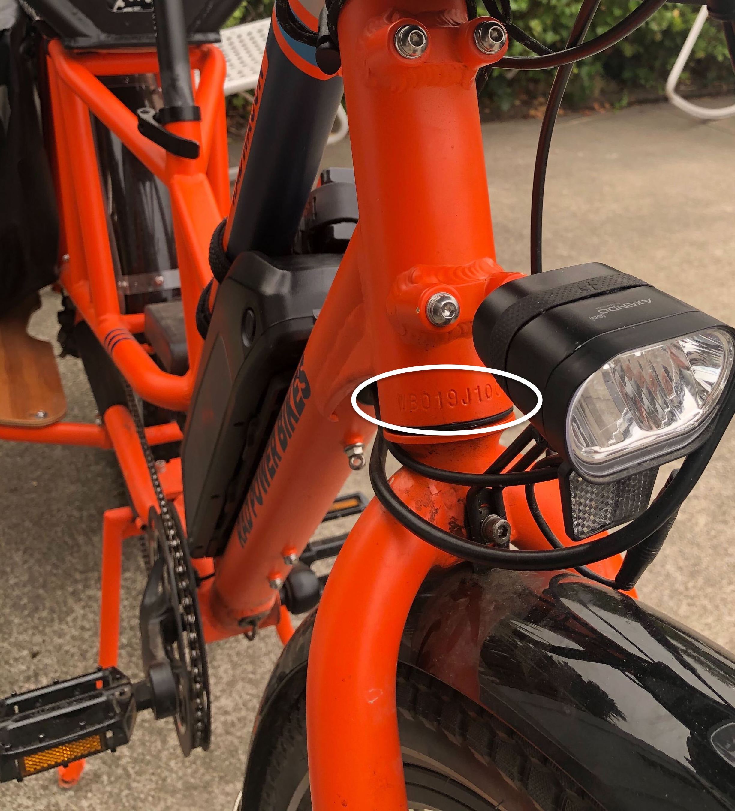 Rad Power bikes have their serial number on the head tube. This is on the front of the bike.